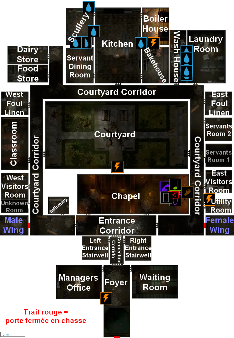 Avec la légende (ci-dessous), vous pouvez retrouver les emplacements des objets maudits, des lavabos, et du disjoncteur.